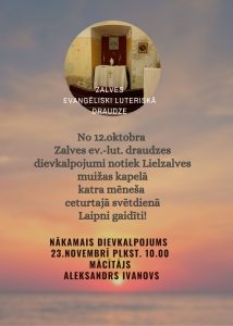 Ar prieku piedāvājam divas telpas Zalves evaņģēliski luteriskajai draudzei dievkalpojumu un citu savu pasākumu rīkošanai.